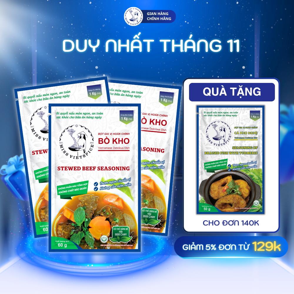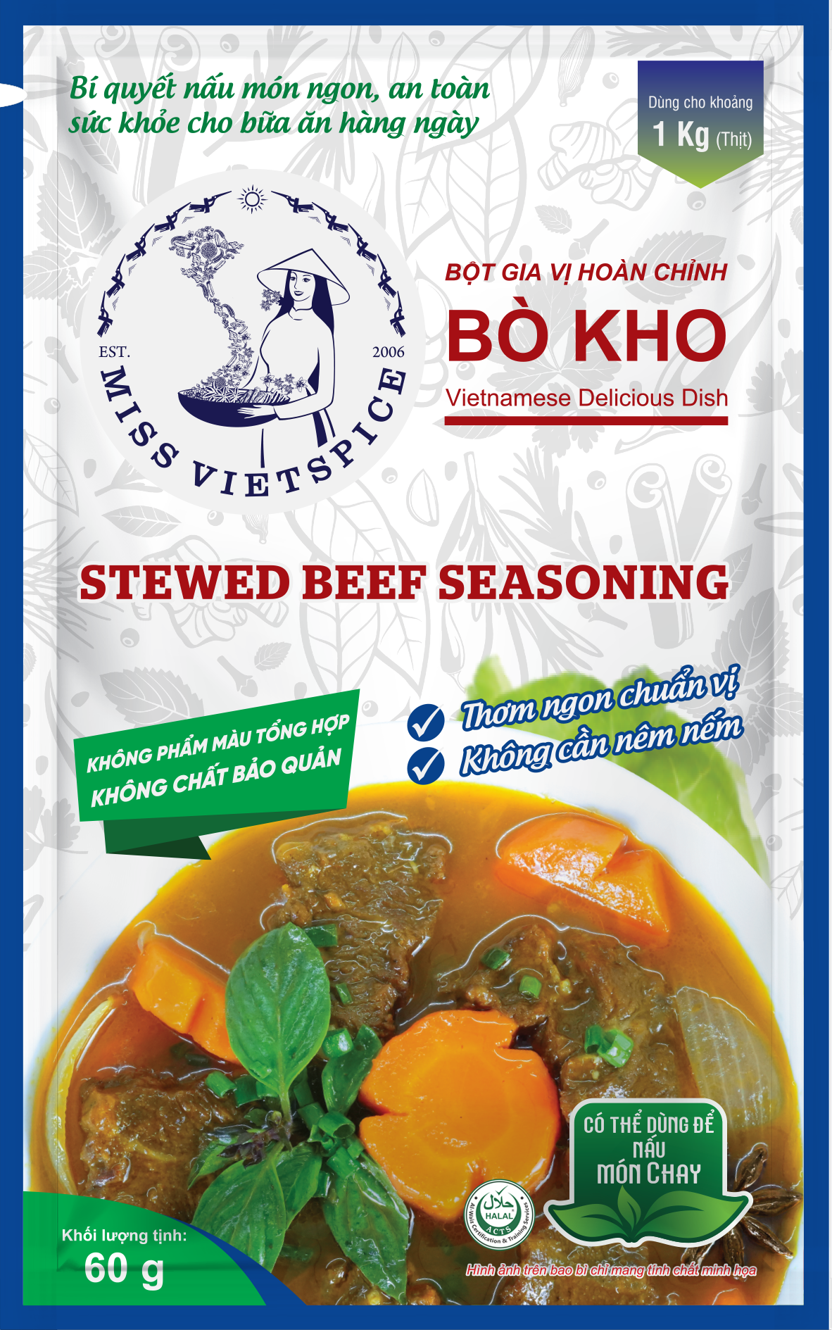 - Công thức gia vị đặc biệt: Công thức gia vị hoàn chỉnh được Miss Vietspice nghiên cứu kỹ lưỡng, giúp bạn dễ dàng chế biến món bò kho đậm đà, thơm ngon, tạo điểm nhấn cho bữa ăn gia đình.