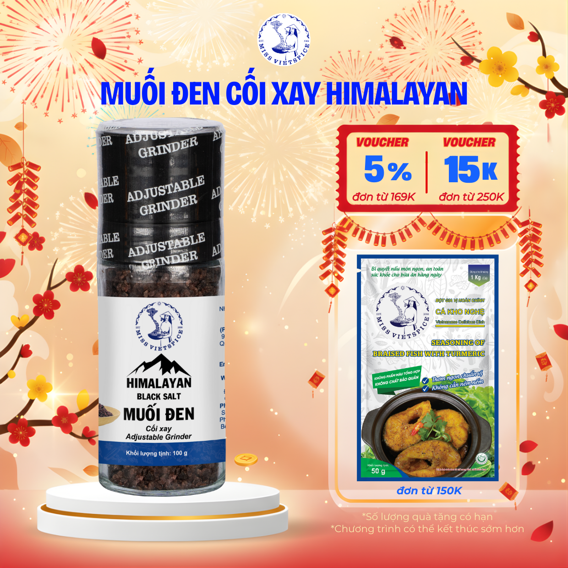 Muối đen cối xay Himalaya từ Miss Vietspice là nguyên liệu tự nhiên nhập khẩu trực tiếp từ Pakistan, không chứa chất bảo quản hay màu nhân tạo. Với vị mặn nhẹ hơn muối trắng do hàm lượng Natri Clorua thấp và chứa chất umami tự nhiên, muối đen giúp giảm lượng bột ngọt khi nấu ăn, đặc biệt tốt cho sức khỏe người lớn tuổi. Đây cũng là một thành phần phổ biến trong ẩm thực Ấn Độ, được biết đến với công dụng chống viêm và ứng dụng trong trị liệu.